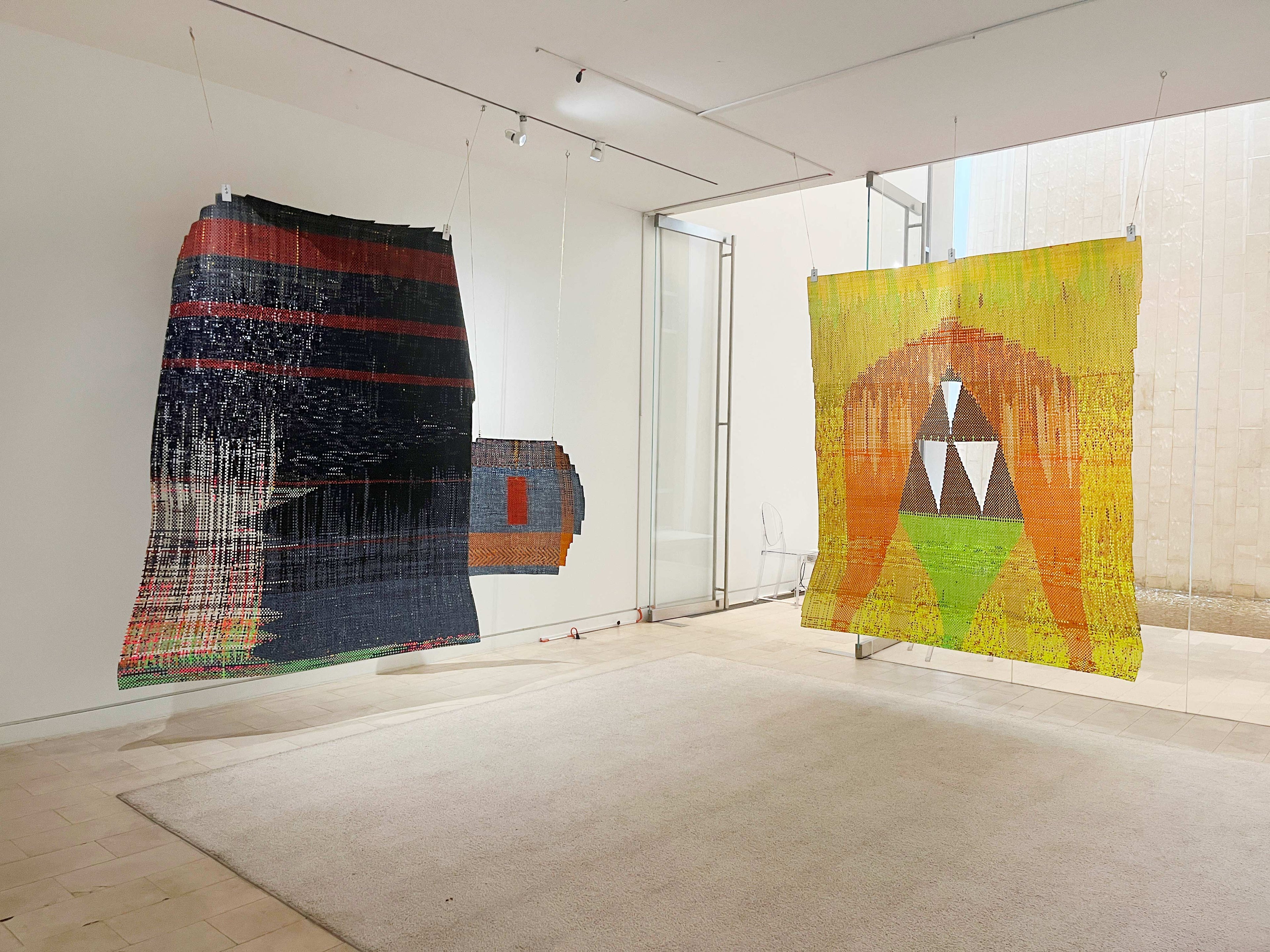 This collection features woven paper constructions inspired by the grid motif, drawing visual influence from diverse cultural traditions, including basket weaving, Scottish tartan patterns, and abstract painting. Lorenzo employs the most fundamental weaving techniques, recognizing their universal presence across various communities. He refined his approach while in graduate school, noting, “Weaving is an ancient art in Mexico. It serves both functional purposes, like sleeping mats, and artistic expression. Its form is universal, appearing across cultures.” These works captivate me with their apparent simplicity—seemingly accessible to anyone—yet they reveal intricate complexity. Designed to be double-sided, they present imagery and meaning on both surfaces.