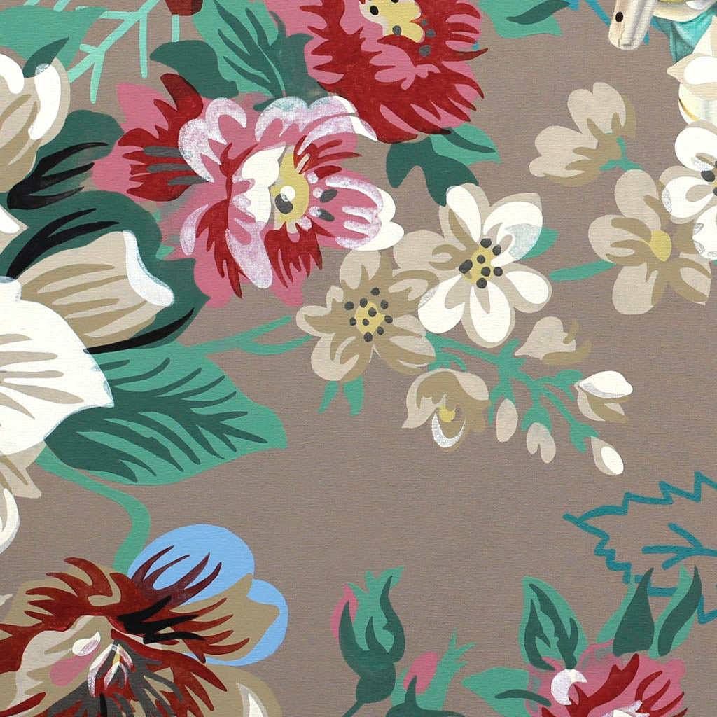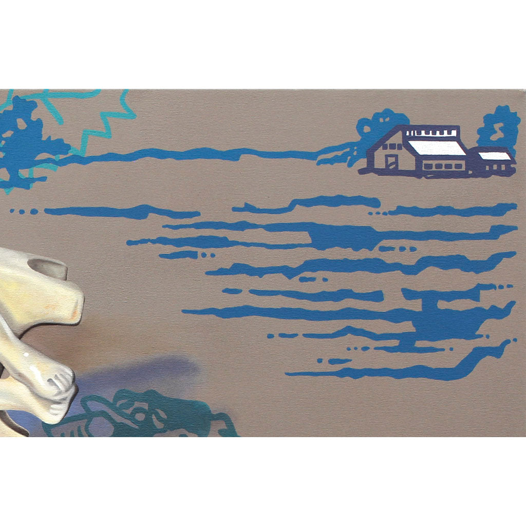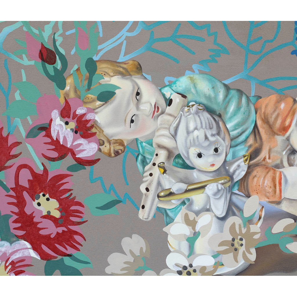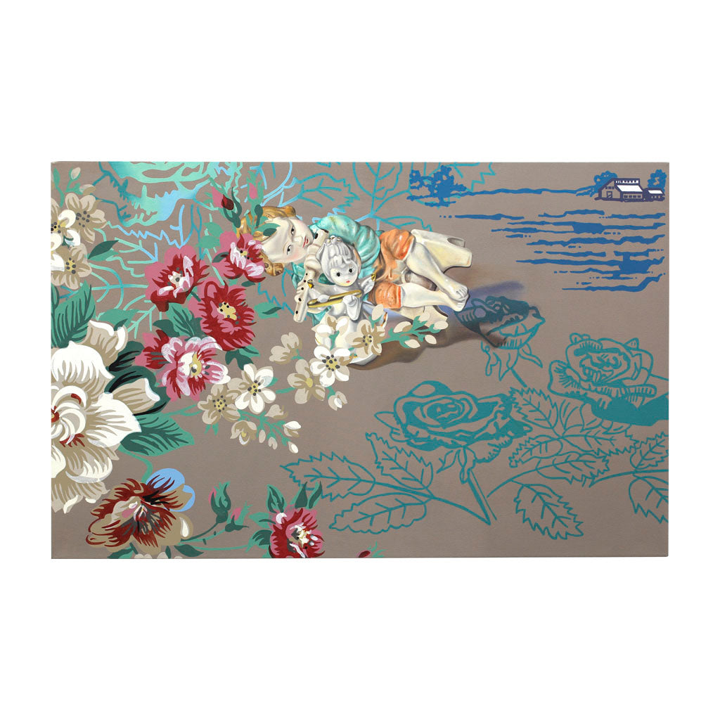 " Paper printed with roses that flower bouquets come wrapped in, vintage silk-screened wallpaper and the stylized farm graphic on an egg carton were the visual inspirations for the environment created in this painting. "Little Angel" was a self-portrait disguised in a painting of figurines playing flutes in a surreal countryside scene. Though I was living in NYC at the time, part of me was longing to live on the land, have a flower garden, and grow vegetables. The romantic relationship, of which I had been part, was weighing me down, as one can see by the boy figurine on the angel's back. I channeled a fair amount of sadness in this picture, but an equal amount of hope. Fortunately, the story unfolded for the best in real life." -Melodie Provenzano