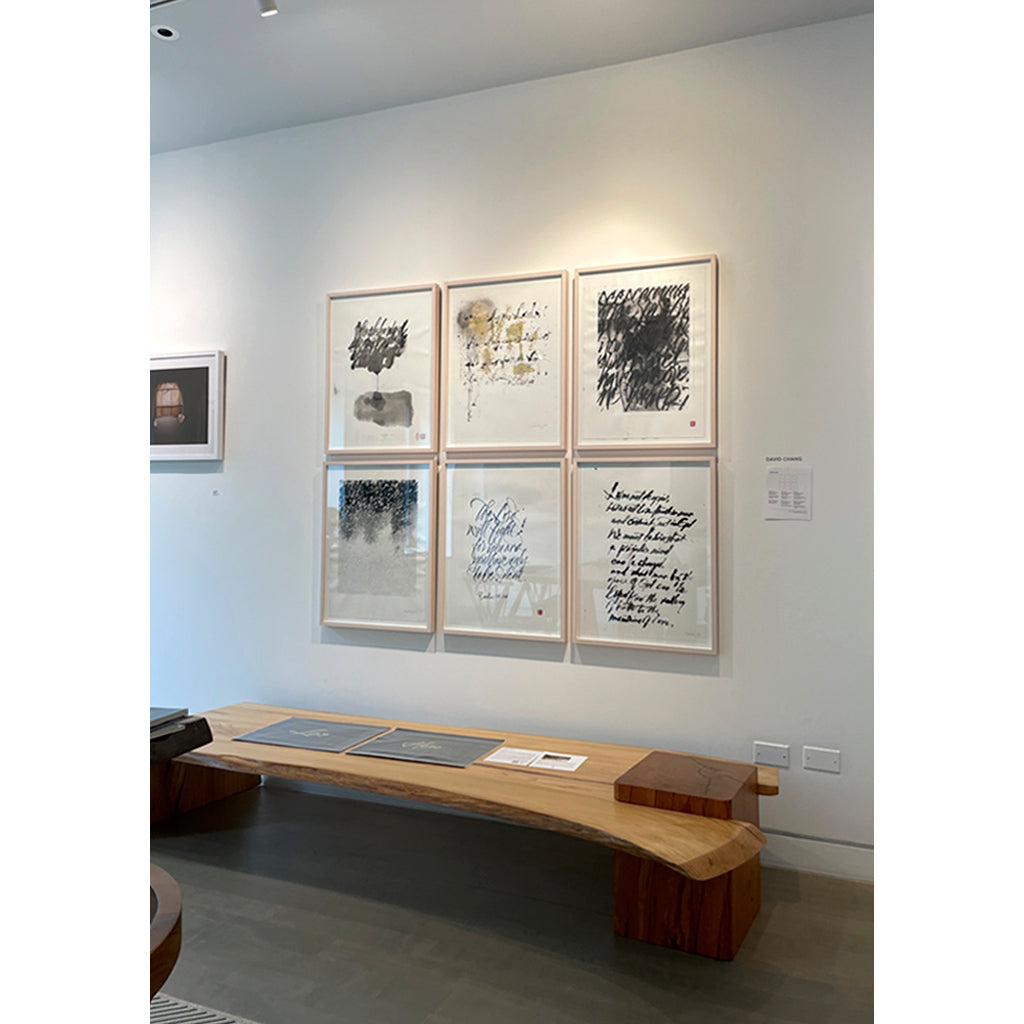 These six selections are part of a larger series of works that evoke the balance between words and visual depictions. Chang spends time praying prior to his creations to forge a space where there is a presence or an encounter with an eternal consciousness. In these encounters, the artist is able to reveal messages and stories of divinity and ultimately the true nature of selfless love behind the scriptures he meditates with.
