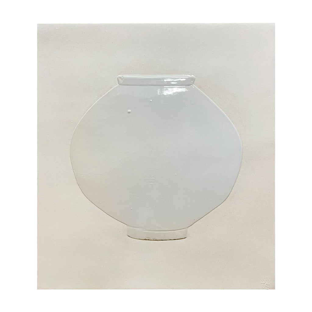 Starting with a blank clay tablet, Lee painstakingly applies up to 70 extremely thin layers of kaolin, a mixture of white clay and water used in porcelain production. Each layer requires a full day to apply and dry. In the next stage, he carefully isolates a raised central shape by scraping and cutting away the background. In this way, he renders, in shallow relief, the outline of the historic ceramic work that is his subject. After applying, where needed, a traditional ornamental pattern in colored pigment, he glazes and fires the work in a kiln. The entire procedure can take up to 90 days from start to finish. The original ceramic objects that Lee depicts include examples of the celebrated white porcelain that made its appearance in the 15th century, and whose elegant minimal forms were prized by the Korean aristocracy. Lee also turns to classic examples of the blue-and-white ware of the same period, noted for the use of cobalt blue pigment to create stylized patterns of birds, dragons, lotuses, and bamboo.